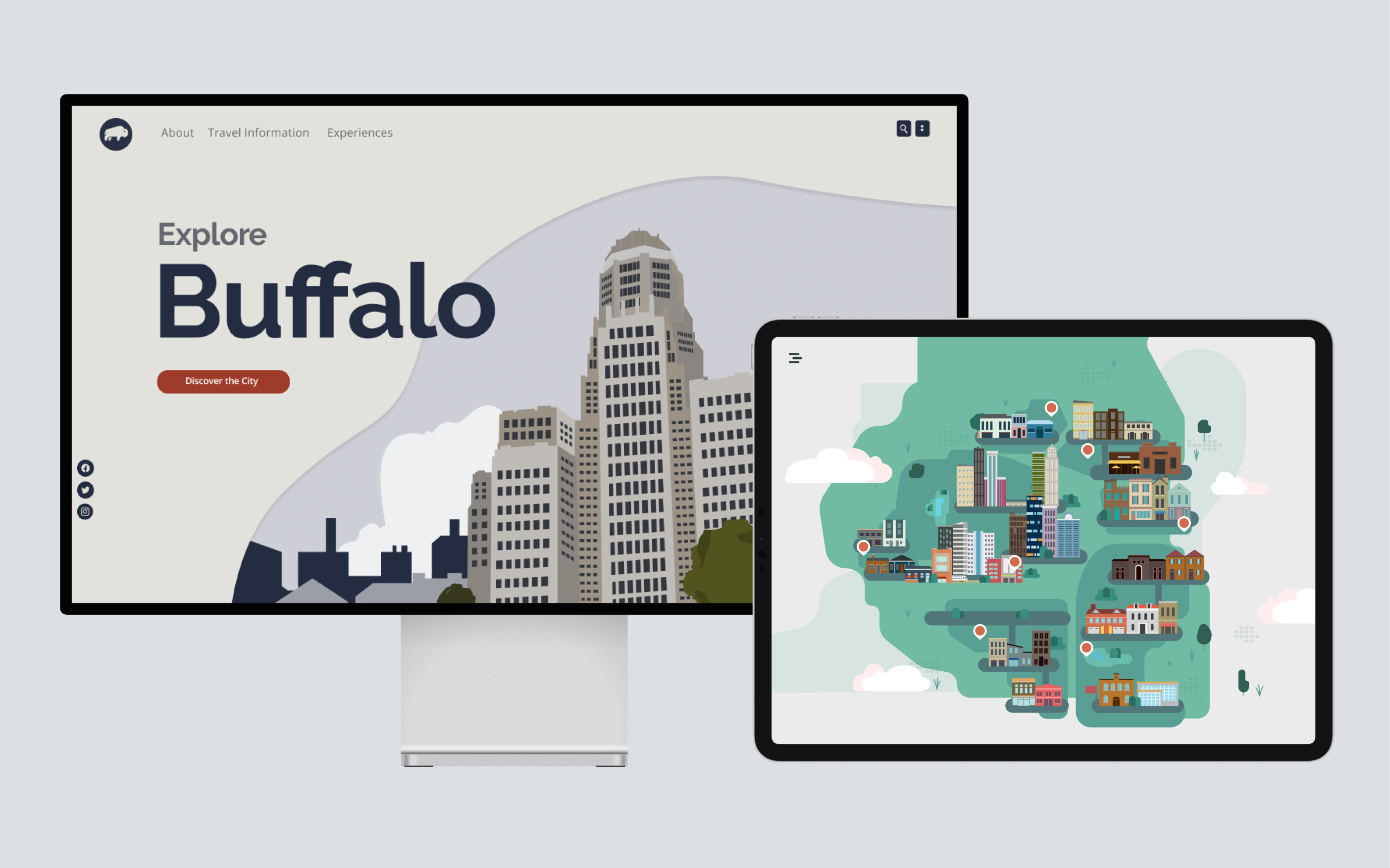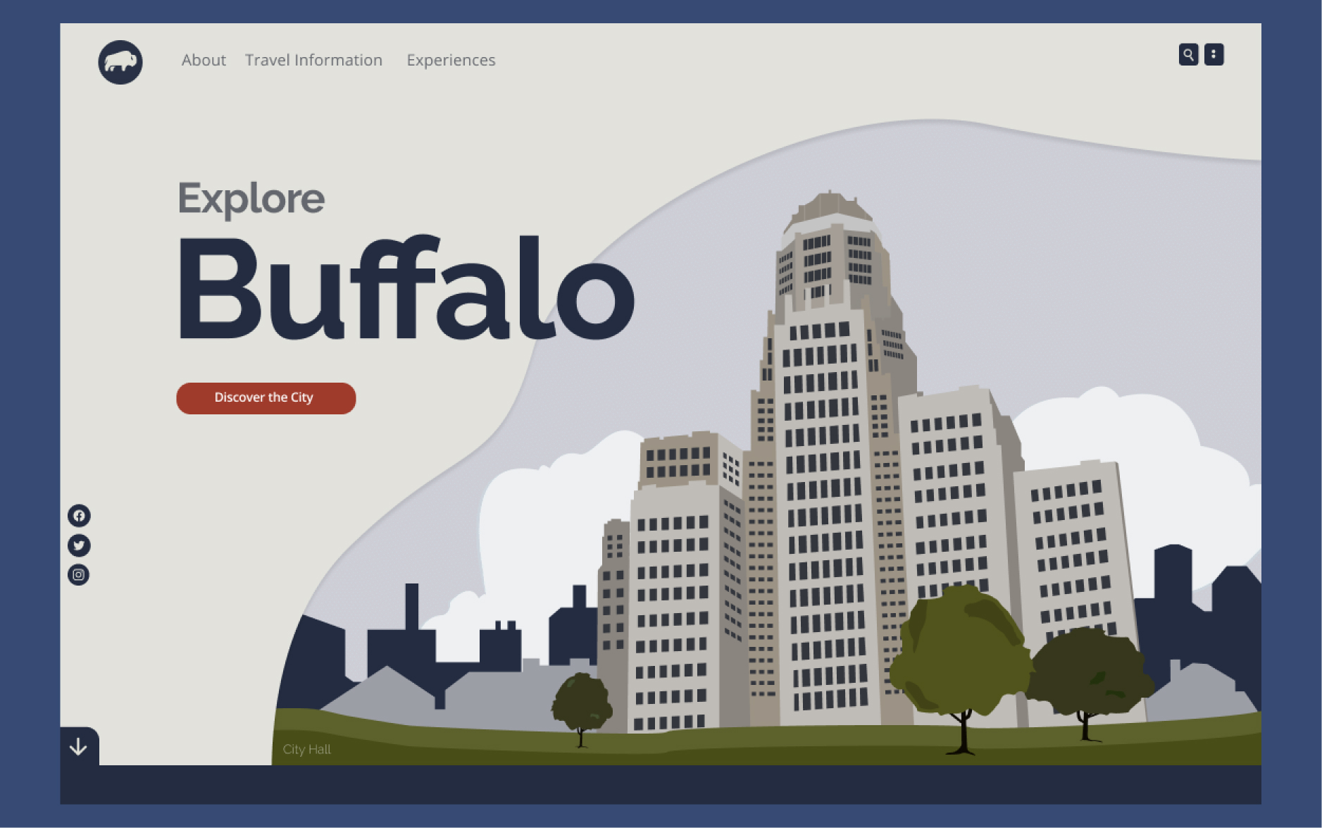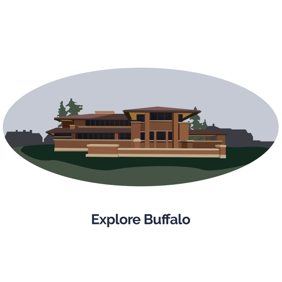 For the Buffalo landing page, inspiration stemmed from the city's rich architectural heritage. I used an illustrative style infused with elements of realism, the design incorporates color-blocking patterns to intricately depict iconic structures.