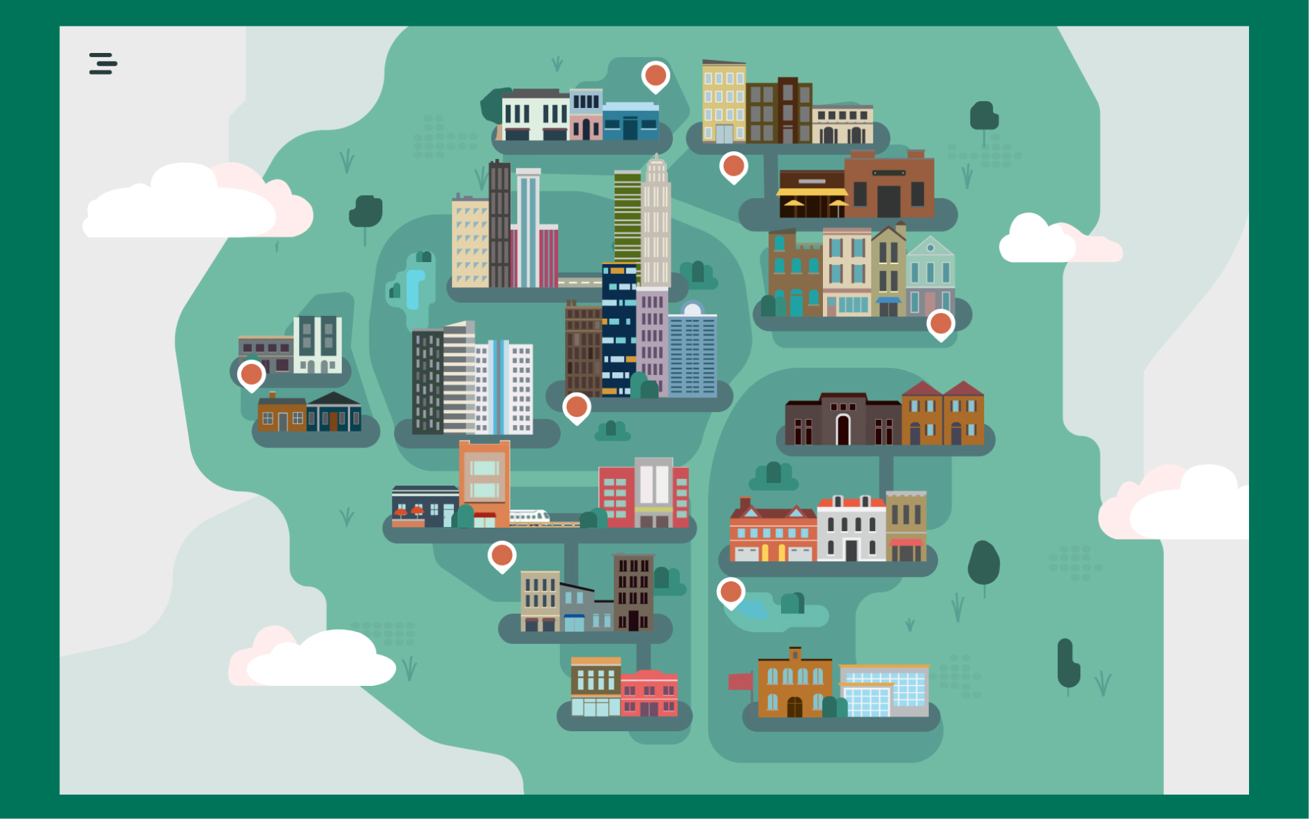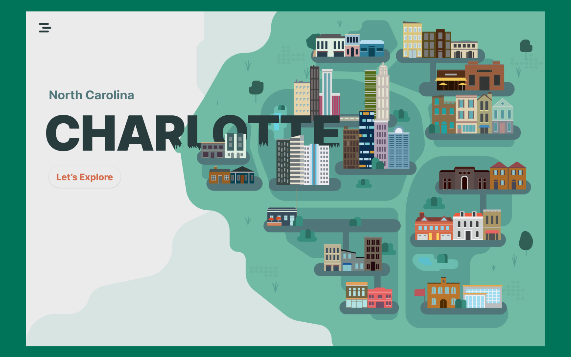 For the Charlotte landing page, I adopted a playful and colorful illustration approach. Each house and building within the design represents a distinctive neighborhood of Charlotte. The landing page visually encapsulates the diversity and charm of the city's neighborhoods, aiming to evoke a sense of exploration and discovery.